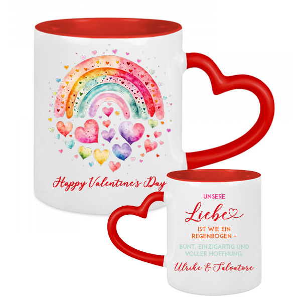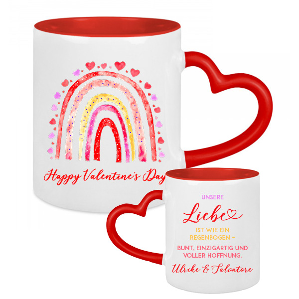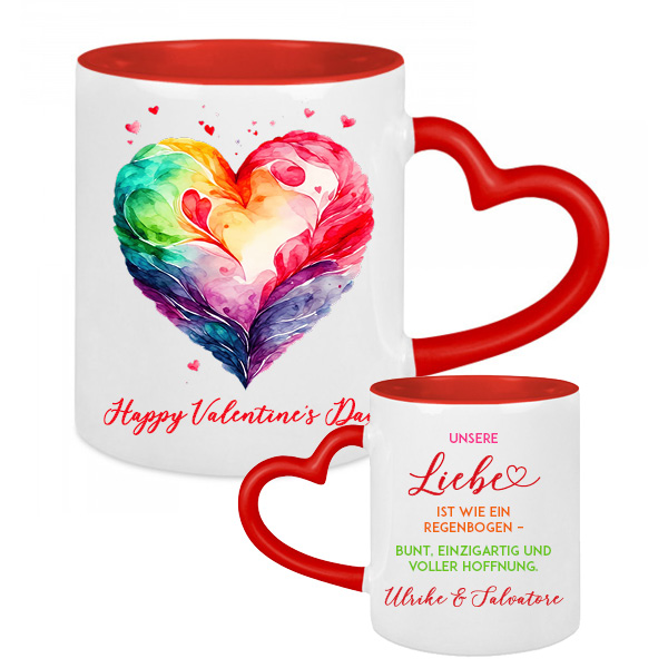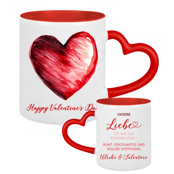 Jedes Exemplar dieser Tassen wird mit Hingabe und Sorgfalt durch das Sublimationsverfahren verziert. Der rote Herzhenkel verleiht jeder Tasse ihre einzigartige Ausstrahlung, während ein liebevoller Spruch auf der Rückseite zusätzlichen Charme verleiht. Um diese Kunstwerke zu unersetzbaren Schätzen für die Beschenkten zu machen, personalisieren wir sie mit euren Namen – eine individuelle Note, die jede Tasse zu etwas Besonderem macht.